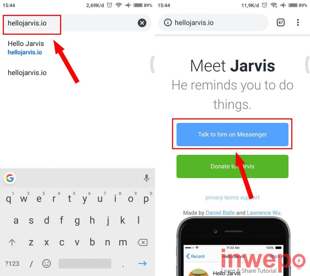 1. Pastikan kamu sudah memiliki FB Messenger kalau belum silahkan download terlebih dahulu. Jika sudah langsung saja buka browser Google Chrome kemudian buka situs hellojarvis.io , berikutnya pilih menu Talk to Him on Messenger.