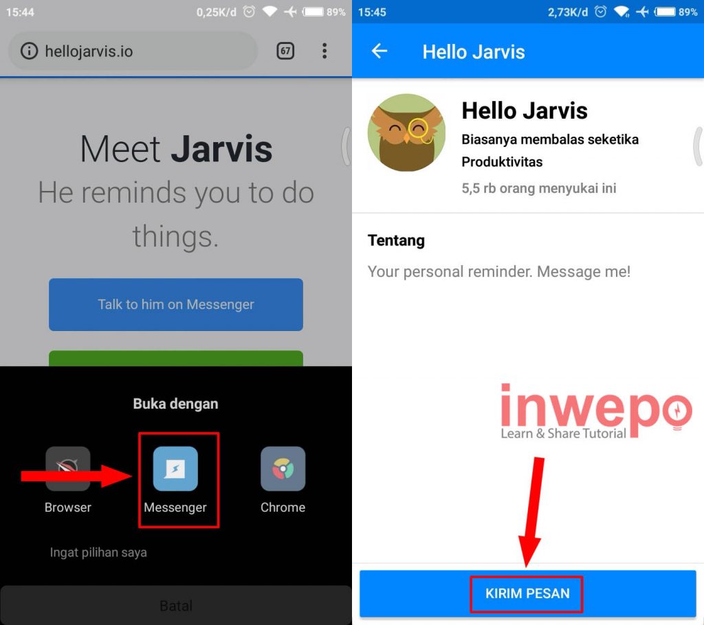 2. Akan muncul pilihan untuk membuka, pilih saja Messenger lalu kamu akan diarahkan langsung ke Messenger berikutnya pilih KIRIM PESAN.