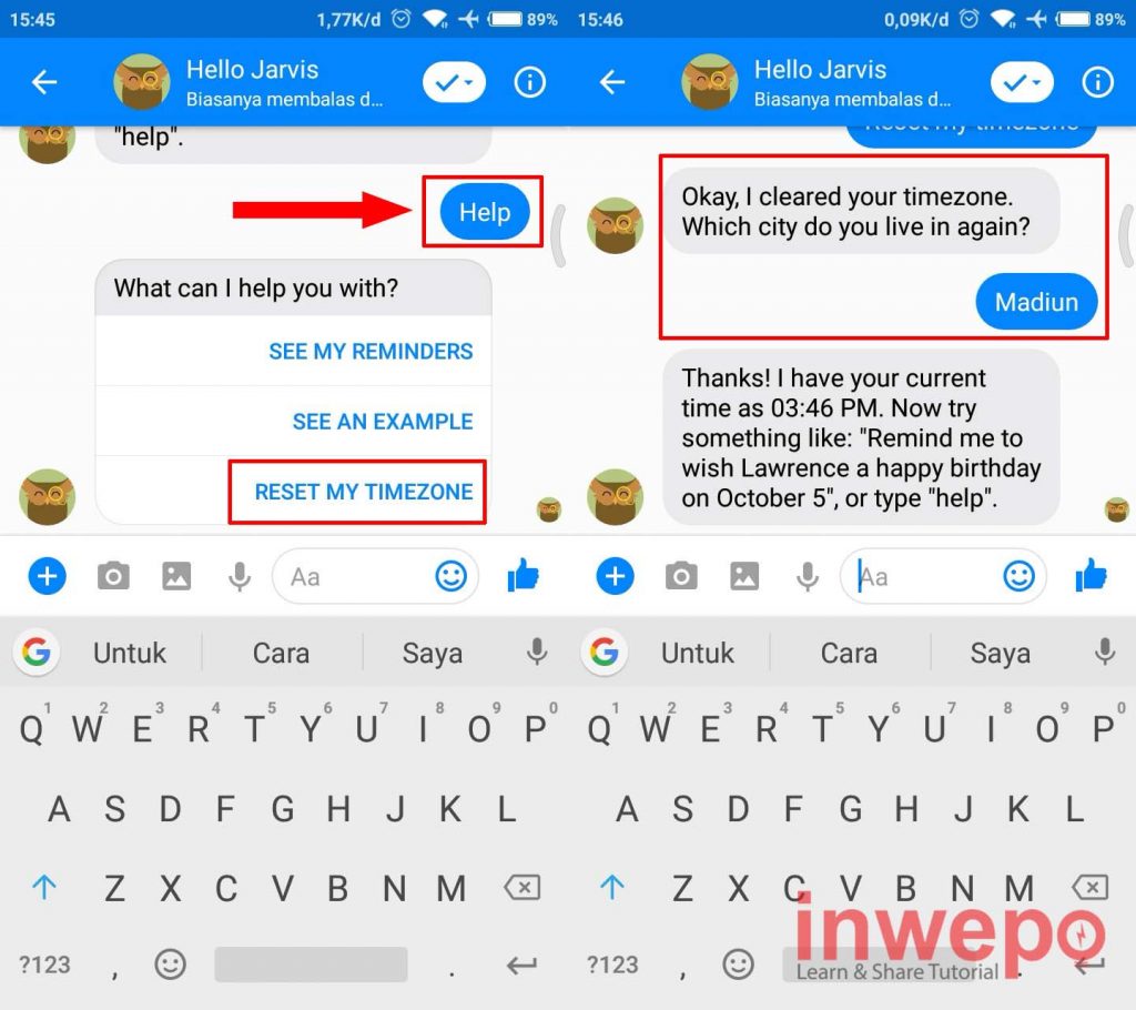 3. Untuk pertama kali menggunakan, biasanya kamu akan ditanyakan tempat tinggal untuk menyamakan zona waktu. Jika tidak kamu bisa mengirim pesan Help kemudian pilih RESET MY TIMEZONE. Selanjutnya kamu akan ditanya dimana kamu tinggal dan jawab saja sesuai tempat domisili kamu sekarang agar zona waktu tersinkron dengan baik.