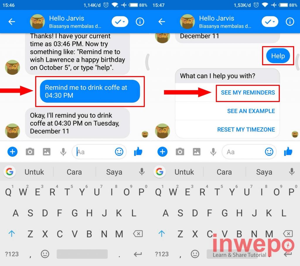 Tidak sampai disitu saja ternyata Facebook Messenger juga telah disisipi fitur bot yang mampu menjadi alat pengingat sewaktu ada acara penting atau aktifitas apa saja yang akan kita lakukan. Nah, penasaran bagaimana cara membuat messenger sebagai mesin pengingat? Langsung saja ke tutorialnya di bawah ini.