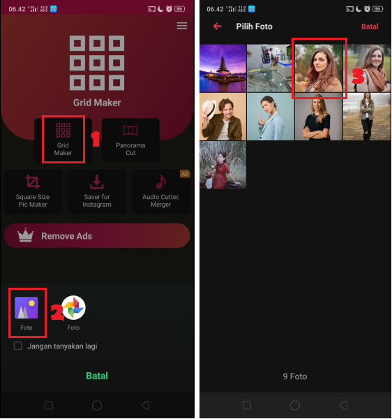 2. Bila sudah ter-install, langsung saja buka aplikasi Grid Maker for Instagram. Pilih ‘Grid Maker’ dan klik folder ‘Foto’ untuk membuka galeri. Pilih foto yang ingin dipotong-potong.