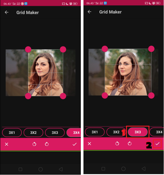 3. Ada beberapa option ukuran potongan yaitu 3×1, 3×2, 3×3, 3×4, 3×5, 3×6, 3×7, 3×8, 3×9, 3×10, 2×1, 2×2, dan 2×3. Pilih option 3×4 untuk membuat feed Instagram menjadi 12 foto, atau pilih option 3×3 untuk membuat feed Instagram menjadi 9 foto. Pilih option ukuran sesuai dengan kebutuhan kamu. Atur juga panjang dan lebar grid yang akan dipotong sesuai dengan kebutuhan kamu. Klik ikon centang di pojok kanan bawah.