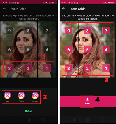 4. Pilih dan klik beberapa nomor di potongan foto untuk mengirimkannya ke feed, direct, atau story di Instagram. Atau klik semua nomor di potong foto dan klik save untuk menyimpan semua foto ke galeri perangkat kamu.