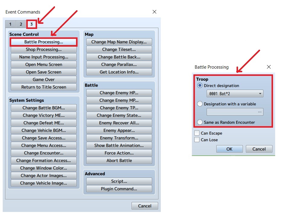 12. Lalu, double click pada baris selanjutnya pada bagian content. Kita ubah ke page 3 dan pilih “Battle Processing”. Ketika muncul menu Battle Processing, kita dapat mengatur musuh yang akan dilawan. Direct Designation akan memunculkan musuh sesuai dengan ketentuan. Same as Random Encounter akan memunculkan sesuai dengan Random Encounter yang ada di atas. Can Escape akan memberikan efek agar dapat kabur sedangkan Can Lose akan memberikan efek agar terjadi sesuatu jika kalah. Jika sudah, klik ok. Pilih bat*2 dan centang pada Can Lose.
