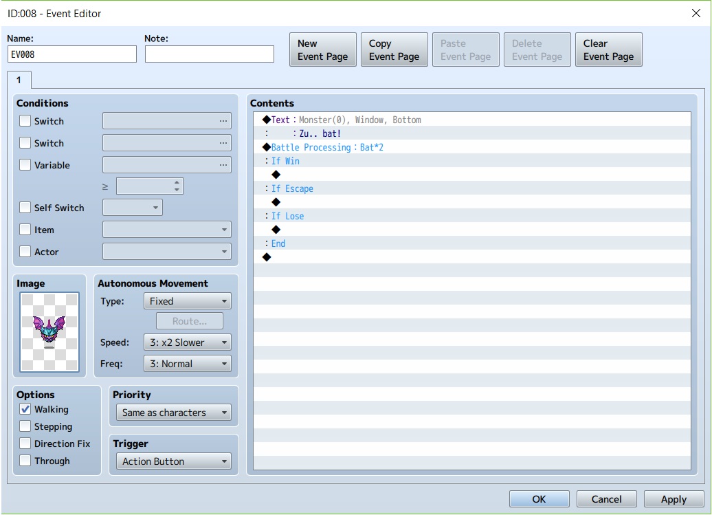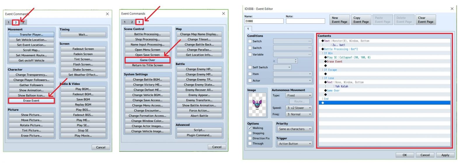 14. Pada if win, kita double click barisnya lalu pilih page 2 dan pilih “erase event” agar monster tersebut tidak muncul lagi. Pada if lose, kita pilih page 3 dan pilih “game over” menyatakan jika kita kalah.