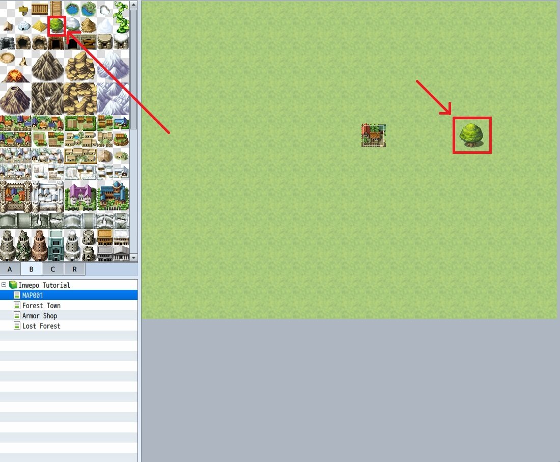 3. Jika sudah, kita pindahkan view ke MAP001 lalu berikan icon pohon untuk membuat transisi seperti pada Map Transition