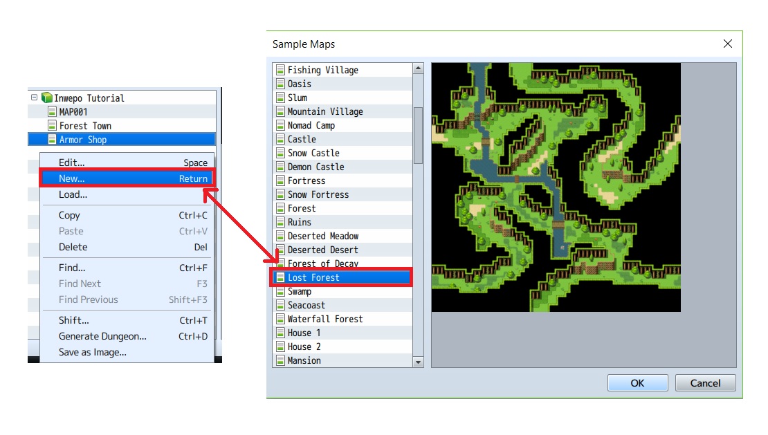 4. Untuk mempermudah tutorial kali ini, kita akan melakukan menggunakan map yang sudah ada. Caranya adalah klik kanan pada Inwepo tutorial di sebelah kiri bawah lalu pilih “load”. Setelah masuk, kita bisa pilih mau set-up apa yang kita gunakan. Pada tutorial kali ini, kita akan menggunakan Lost Forest. Klik OK.
