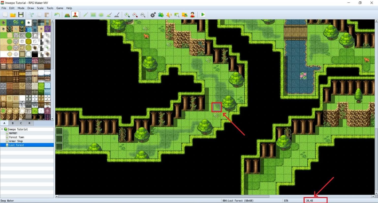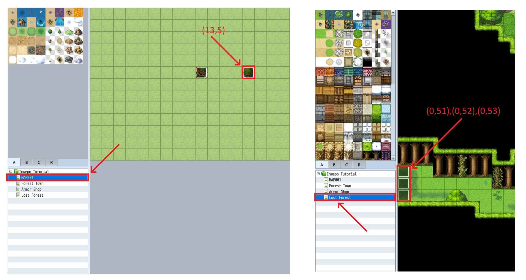 5. Lalu kita buat map transisi pada icon pohon(13,5) dan pintu masuk dari map Lost Forest(0,51), (0,52), dan (0,53). Lihat pada Map Transition. Jika sudah, harusnya karakter kita sudah dapat memasuki map kita tanpa masalah.
