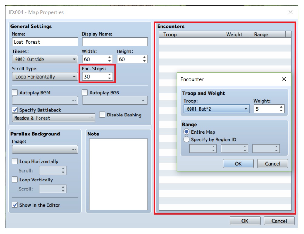 8. Disini kita bisa mengatur banyaknya langkah yang diperlukan sebelum bertemu dengan musuh pada “Enc. Steps”. Semakin besar angkanya, semakin banyak langkah yang diperlukan. Kita juga dapat mengatur musuh apa saja yang akan ditemui pada “Encounters”. Double click pada garis lalu kita bisa tentukan musuh macam apa yang akan di lawan. Weight adalah berapa besar kemungkinan musuh keluar. Semakin besar semakin sering keluar. Lalu range adalah jangkauan dari musuh yang akan keluar. Kali ini kita melawan bat dengan weight 5.