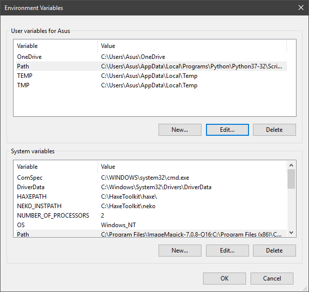 2. (Opsional) Jika kita ingin mendaftarkan aplikasi pada PATH Windows, pilih opsi Path (pada kolom variabel), lalu klik tombol Edit pada pengaturan Environment Variables (baik pada User Variables maupun System Variables).