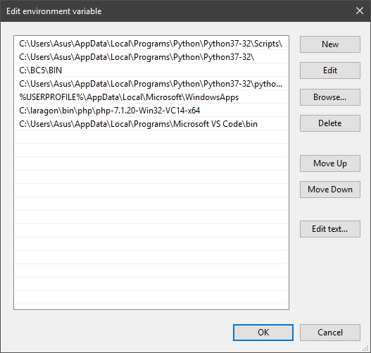Nantinya, akan muncul halaman baru berupa kumpulan lokasi direktori yang dapat diakses melalui CMD maupun Run pada Windows. Untuk mendaftarkan aplikasi yang kita inginkan, klik tombol New, lalu masukkan alamat direktori aplikasi yang di tuju. Jika sudah, klik OK.