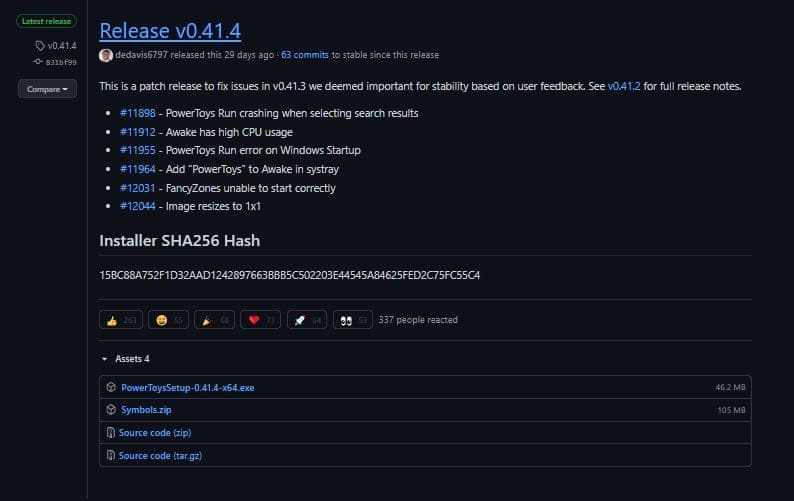 3. Selanjutnya, kita akan dialihkan pada laman repository proyek PowerToys di GitHub Microsoft. Di sini kamu mungkin akan bertanya, mengapa untuk kita langsung menuju laman GitHubnya saja ?. Pada 2 laman sebelumnya, terdapat informasi penting mengenai speksifikasi minimal untuk PowerToys dan bagaimana fitur-fitur didalamnya menambahkan good experience kita selama menggunakan Windows. Pilih bagian dengan extension.exe di assets proyek tersebut.