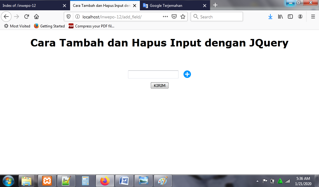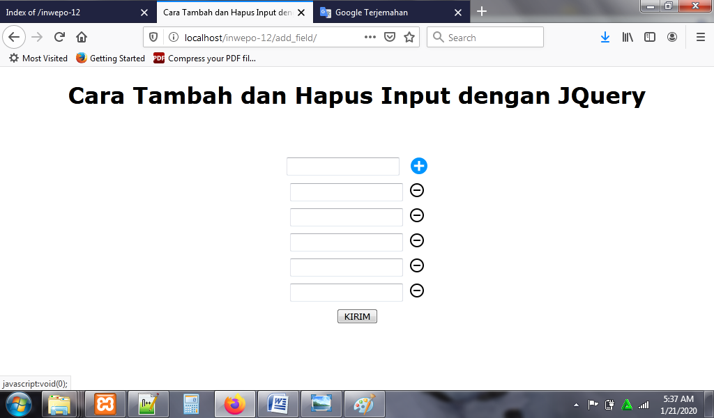 6. Reload alamat url : http://localhost/addDelInput. Tapi fitur tambah hapus field input belum berfungsi.