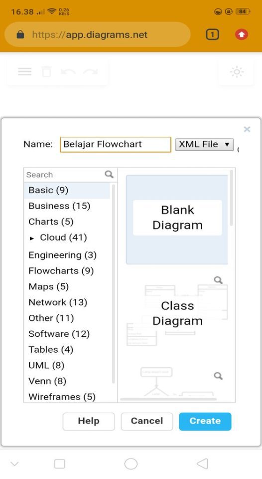 5. Berikan nama flowchart kita dengan nama belajar flowchart. Anggaplah sebagai awalan kita belajar flowchart menggunakan draw io :