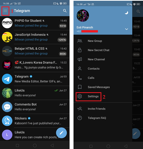 2. Klik ikon tiga garis dipojok kiri atas untuk membuka semua menu pengaturan akun Telegram kamu. Di menu pengaturan akun, cari dan klik menu ‘Setting’.
