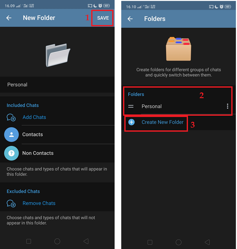 5. Klik save untuk menyimpan folder Personal yang baru saja dibuat. Klik ‘Create New Folder’ dan lakukan langkah serupa seperti diatas untuk membuat folder lainnya seperti folder groups, folder channel, folder bots, dan folder lainnya sesuai dengan kebutuhan kamu.