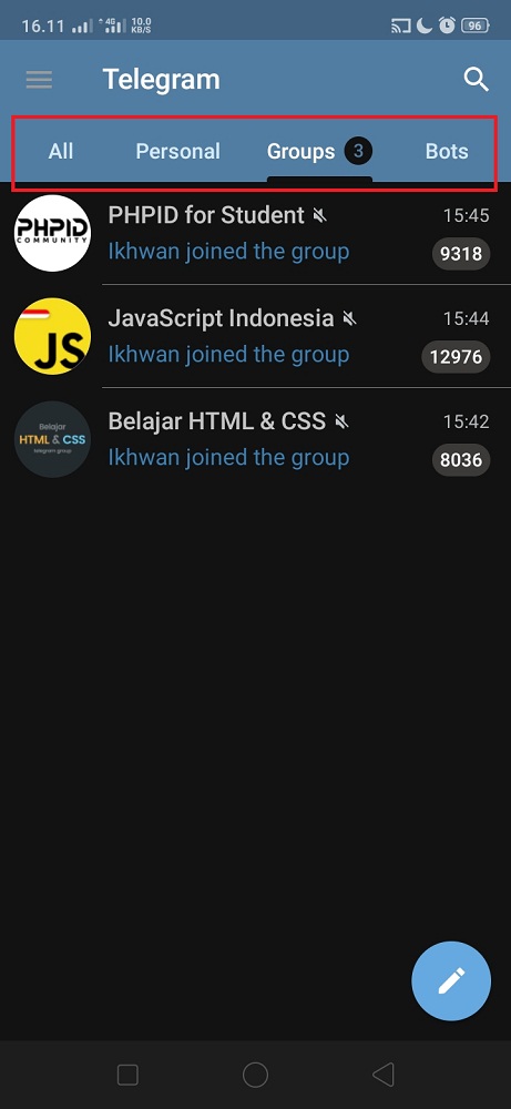6. Berikut tampilan beberapa folder chat yang sudah dibuat. Folder All akan menampilkan semua chat yang ada di akun Telegram. Folder Personal hanya akan menampilkan chat yang berasal dari nomor telepon. Folder Groups hanya akan menampilkan chat yang berasal dari grup Telegram yang diikuti. Sedangkan, folder Bots hanya akan menampilkan chat bots yang digunakan di akun Telegram.