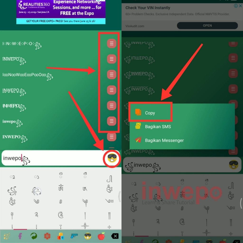 3. Kamu bisa menambahkan simbol dengan men-tap icon emoji lalu jika sudah tap icon box merah di sebelah kanan dan tap menu copy.