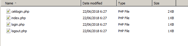 3. Buat 4 file baru, yaitu login.php, ceklogin.php, logout.php dan index.php