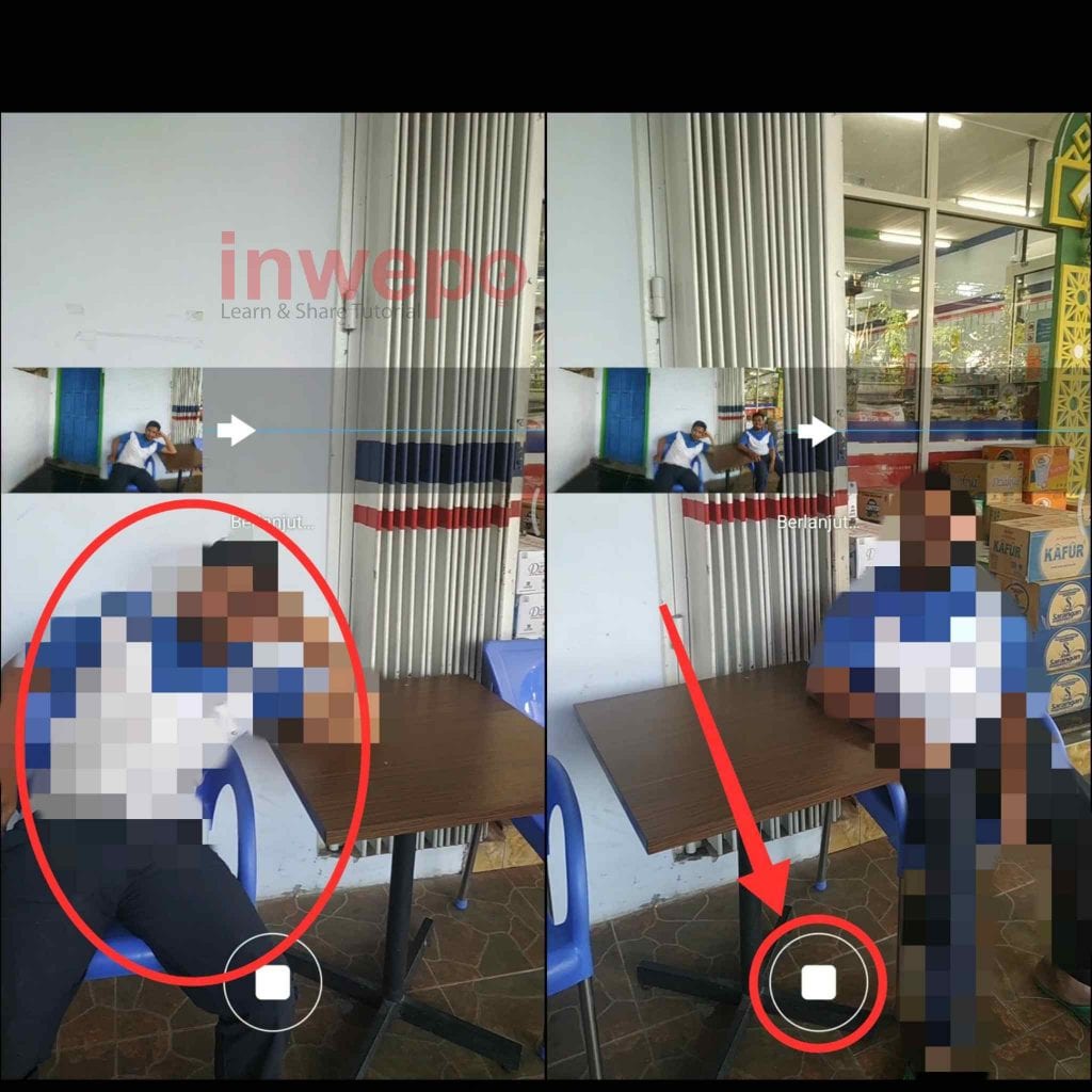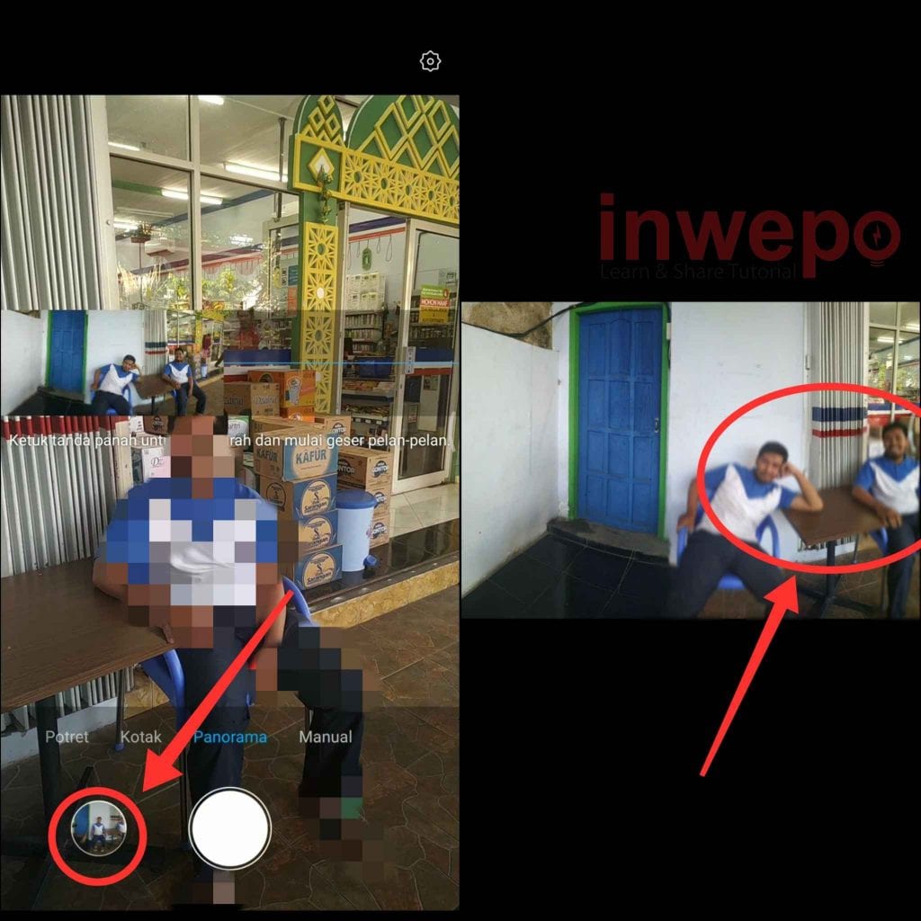 2. Arahkan kamera melewati objek (orang) , setelah kamera melewati objek suruh objek memutar membelakangi kamera dan berada di sudut sebelahnya. Jika kamera sudah melewati objek pada sudut sebelahnya. Tap icon stop untuk menyudahi mode panorama.