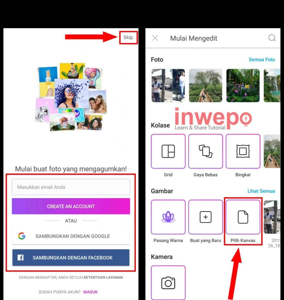 2. Buka aplikasi Picsart lalu login menggunakan email dan akun media sosial atau langsung tap Skip untuk langsung mengedit. Selanjutnya pilih menu Pilih kanvas.