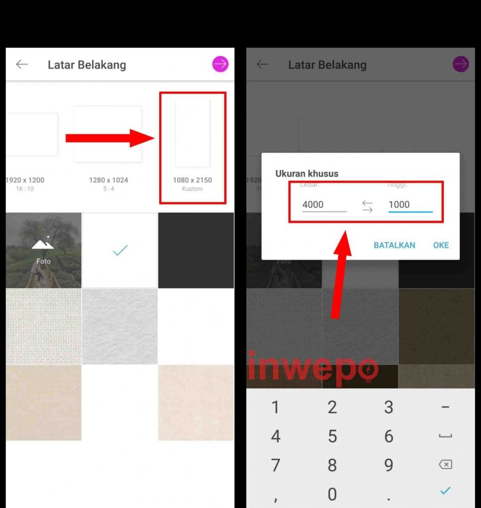 3. Pilih menu Kustom untuk membuat ukuran sendiri lalu atur ukuran lebar 4000 dan tinggi 1000.