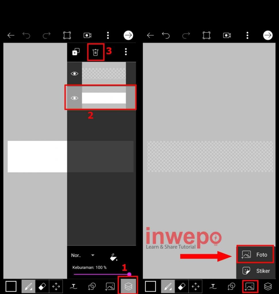 4. Tap menu layer di pojok kanan bawah lalu tap background putih kemudian hapus menggunakan icon tempat sampah agar background menjadi transparan. Berikutnya tap icon picture lalu pilih foto untuk mulai menambahkan foto.