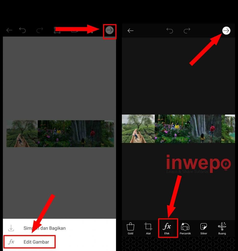 6. Jika sudah tap icon panah di bagian atas lalu tap Edit gambar. Berikutnya pilih menu efek untuk menambahkan filter dan efek pada foto.