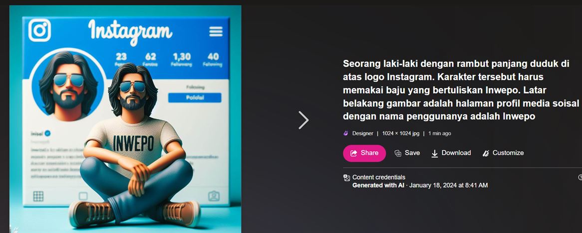 “Seorang laki-laki dengan rambut panjang duduk di atas logo Instagram. Karakter tersebut harus memakai baju yang bertuliskan Inwepo. Latar belakang gambar adalah halaman profil media sosial dengan nama penggunanya adalah Inwepo”.