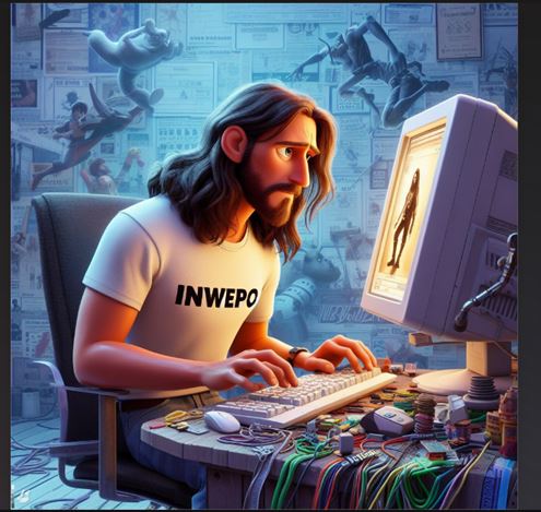 “Poster Pixar, seorang laki-laki berambut panjang, mengenakan baju yang bertuliskan Inwepo, duduk sambil memainkan game di komputer canggih. Animasi 3D”