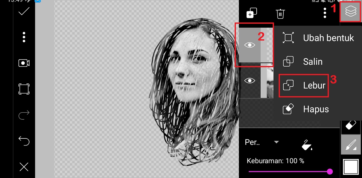 11. Pilih ‘Lapisan’ – pilih lapisan coret-coret – klik titik tiga – pilih ‘Lebur’.