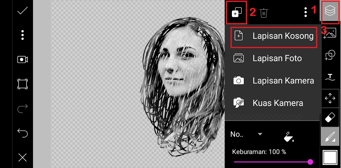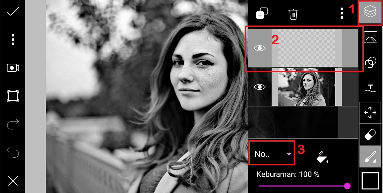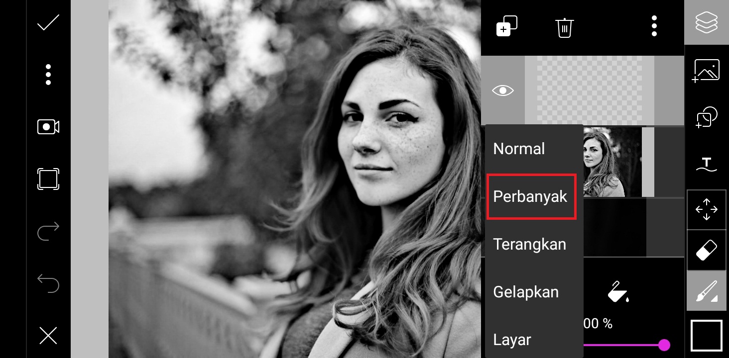 6. Klik ‘Lapisan’ – pilih lapisan kosong di atas lapisan foto – ubah pengaturan lapisan dari normal menjadi perbanyak.