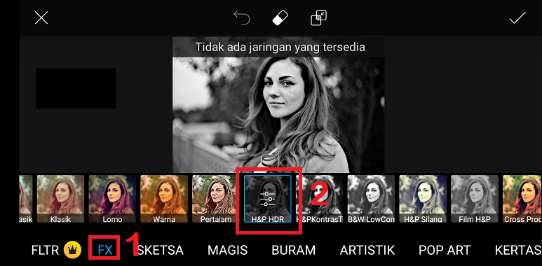 Pilih ‘FX’ – cari dan klik efek ‘H&P HRD’ – klik centang.
