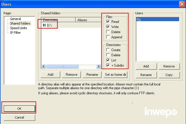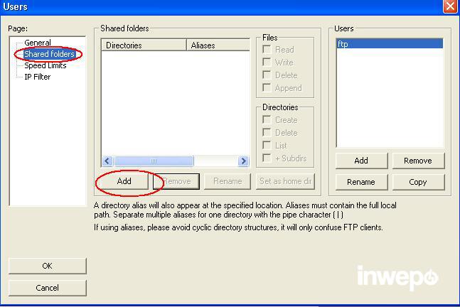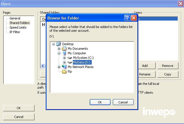 4. Kemudian pilih Shared folder, pilih tombol Add (untuk memilih folder partisi yang akan dijadiakan FTP folder)