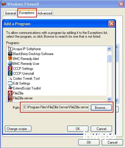 dan di menu exceptions > add program > browser > filezilla server (C:Program FilesFileZilla Server).