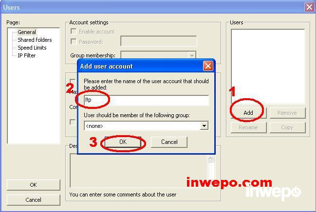 2. Add user account, masukan username sesuai yang diinginkan, contoh: ftp