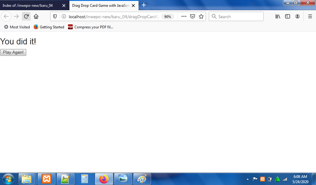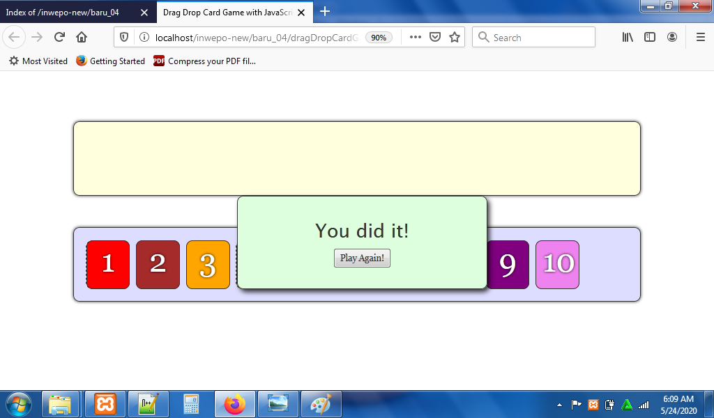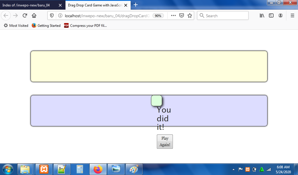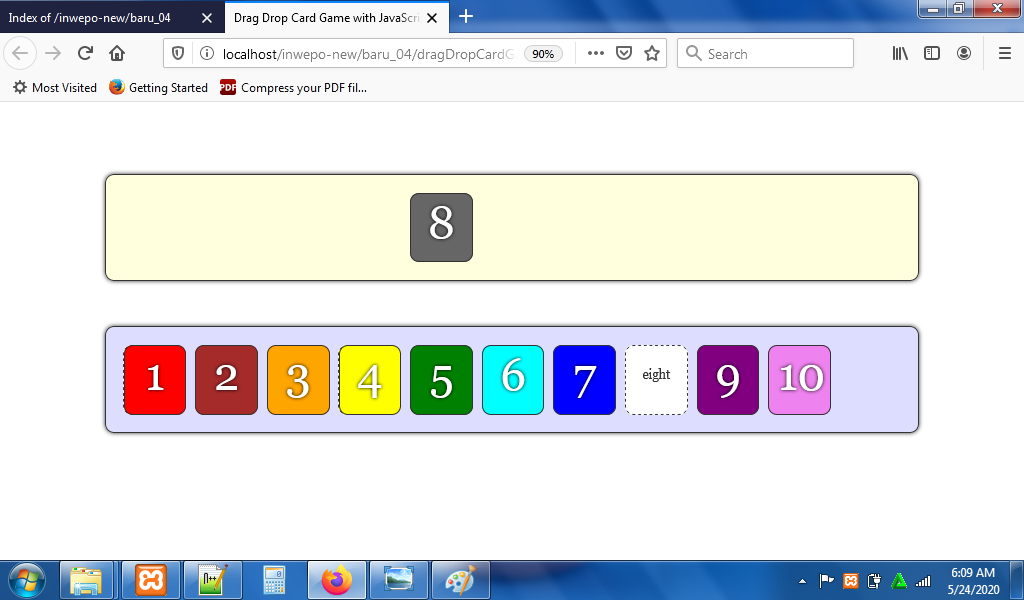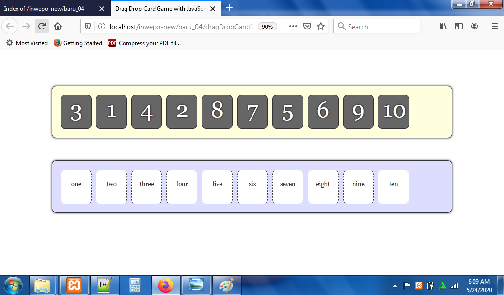 Simpan kode HTLM5 di atas di folder xampplite – htdocs – buat folder baru dengan nama DragDropCard – simpan kode di atas dengan nama index.html.