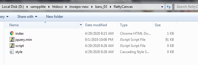 Simpan kode JavaScript di folder xampplite – htdocs – buat folder baru dengan nama FlattyCanvas– simpan code JavaScript dengan nama script.js.