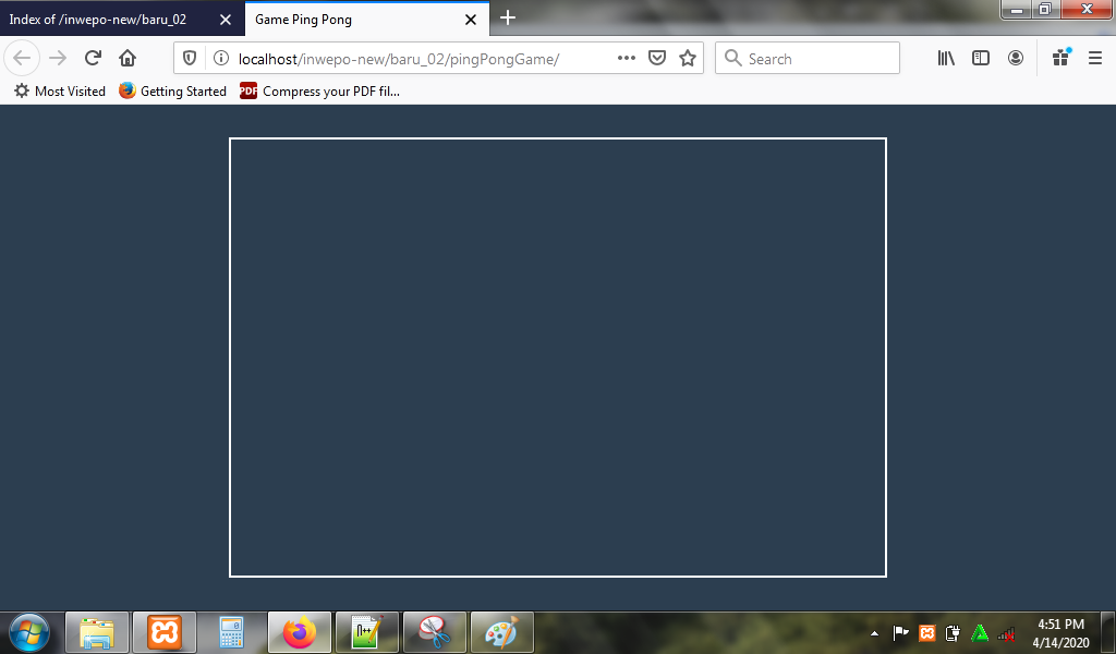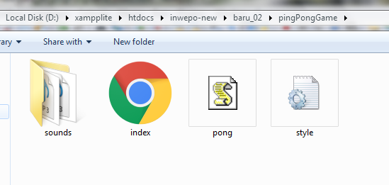 Simpan kode HTLM5 di atas di folder xampplite – htdocs – buat folder baru dengan nama PingPongGame – simpan kode di atas dengan nama index.html.