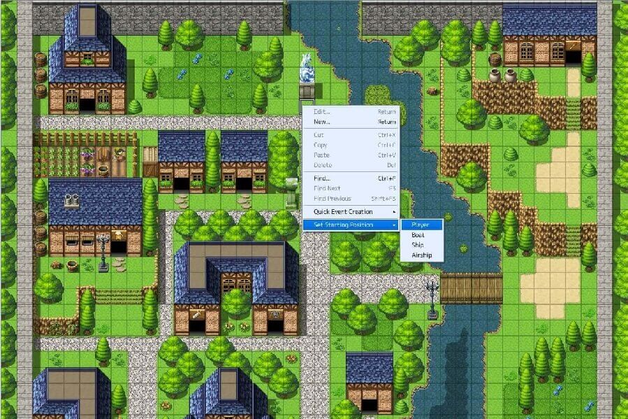 8. Kota kita telah jadi. Untuk membuat player kita berada di dalam kota, kita tinggal mengklik kanan pada salah satu kotak yang tersedia dan pilih “Set Starting Potition” lalu pilih “Player”. Maka Player kita akan berada disitu.