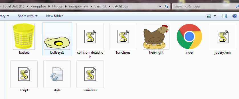 Simpan kode JavaScript di folder xampplite – htdocs – buat folder baru dengan nama CatchEggs– simpan code JavaScript dengan nama script.js.