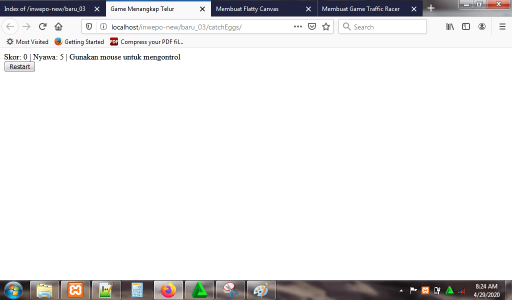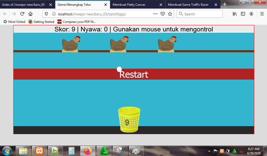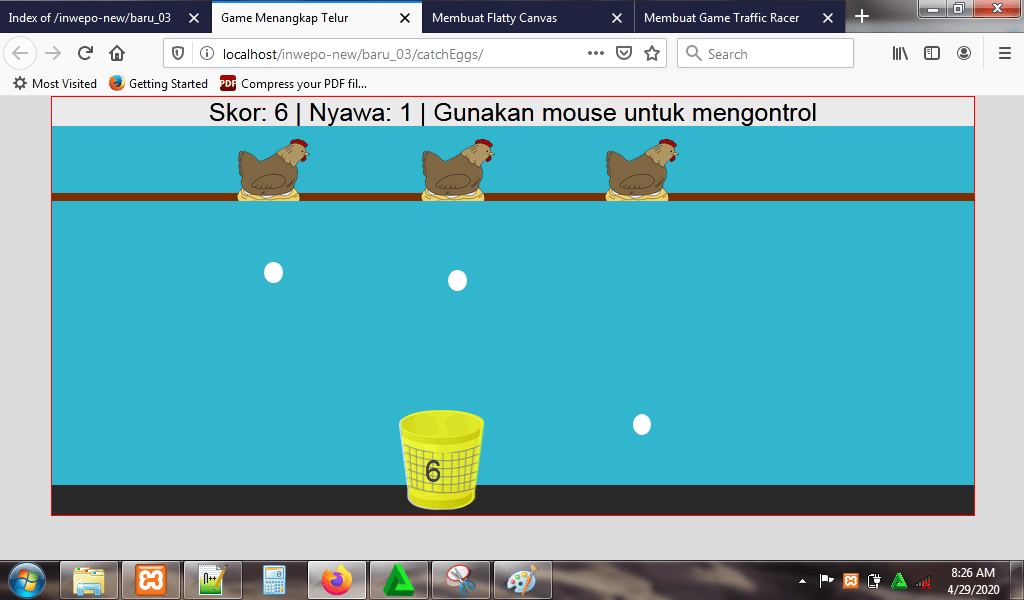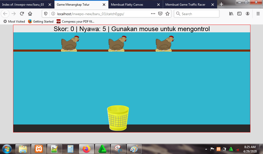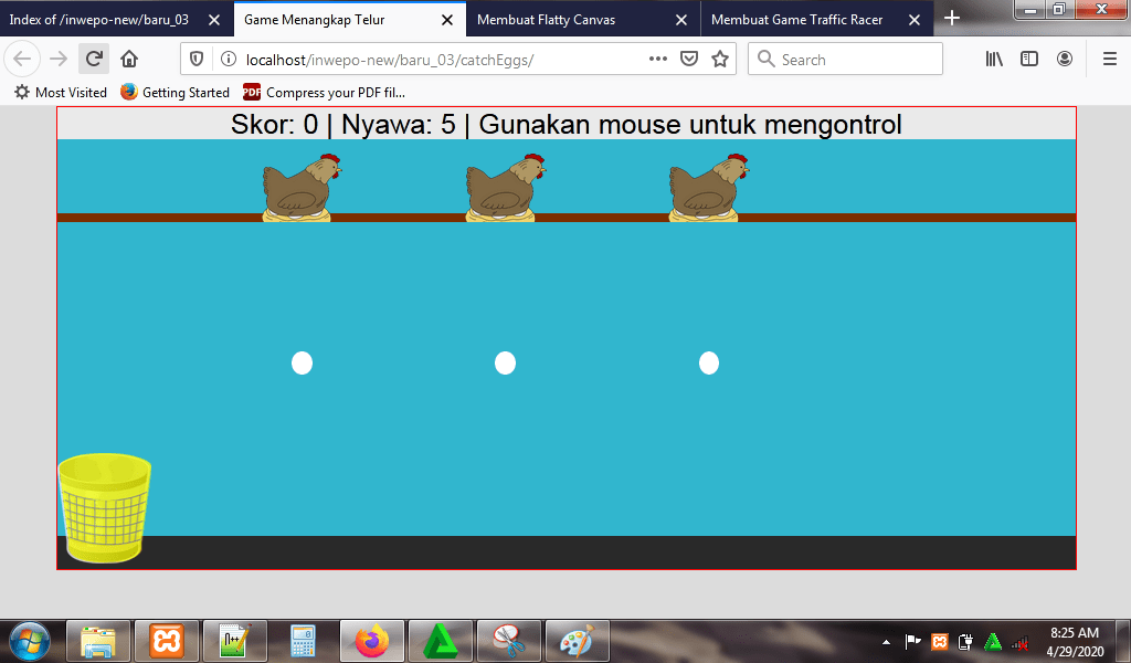 4. Untuk melihat hasil script code di atas, kamu bisa buka browser kamu ketiklah http://localhost/CatchEggs.