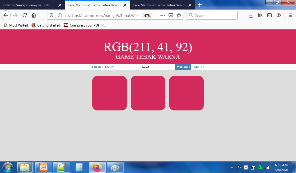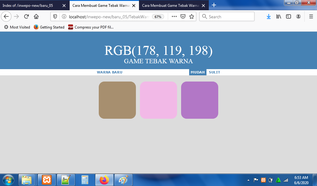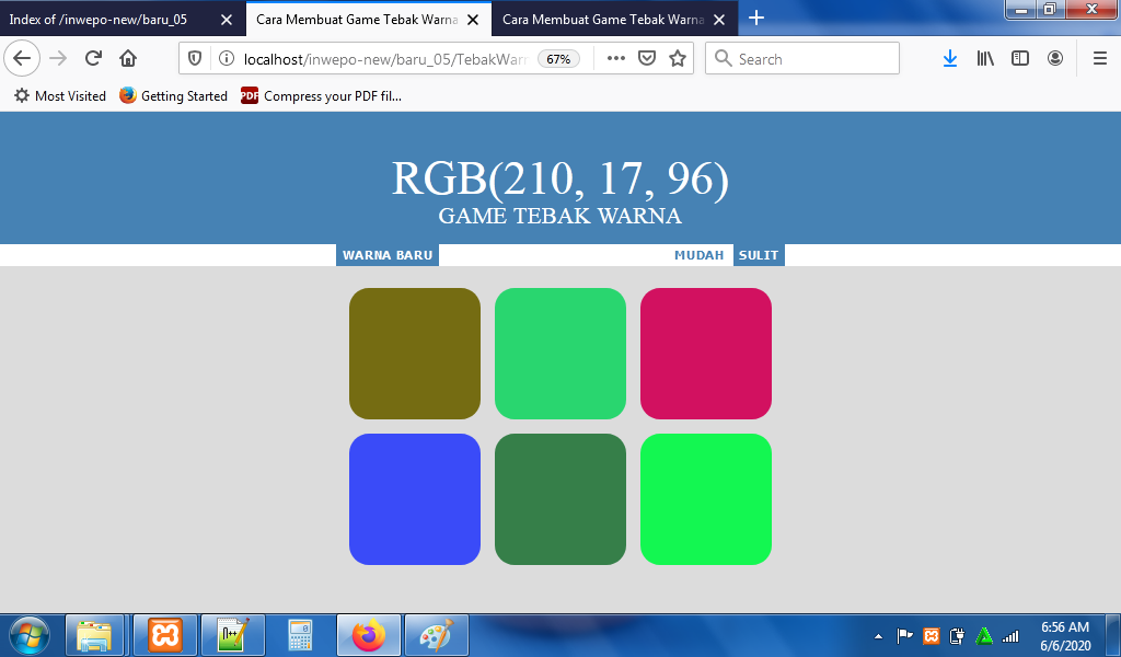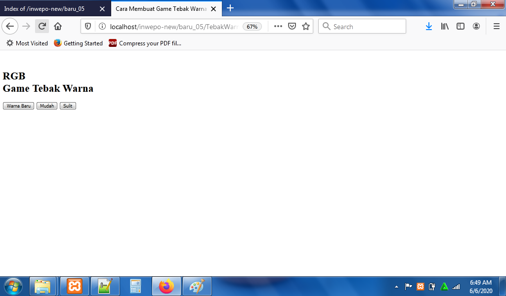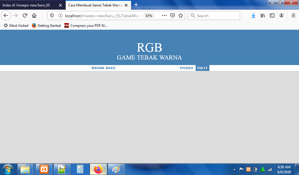 3. Untuk melihat hasil script code di atas, kamu bisa buka browser kamu ketiklah http://localhost/TebakWarnaRGB.
