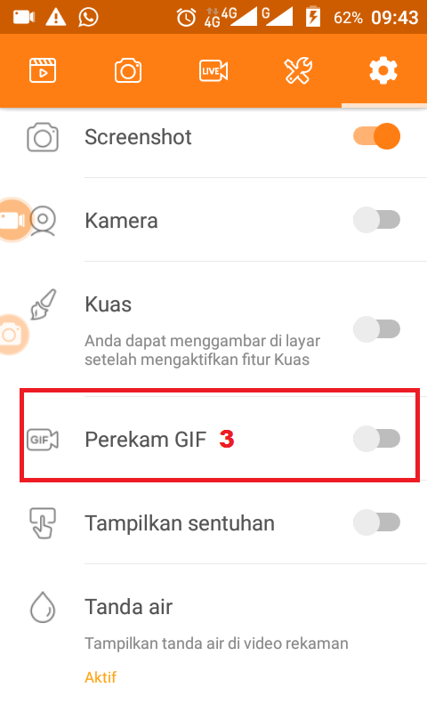 3. Bagi kamu yang punya smartphone layar kecil, silahkan scroll ke bawah dulu. Kemudian, ketuk turn on pada opsi Perekam GIF.