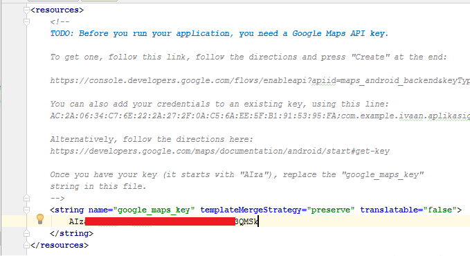 3. Kemudian akan terbentuk activity dan layout untuk maps. Pada value > google_maps_api.xml isikan API KEY yang telah didapatkan pada tutorial bagian 3. Isikan seperti pada bagian merah di bawah ini :