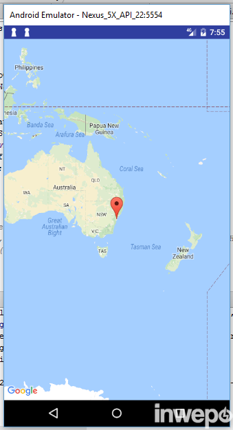 5. Jika telah ditambahakandan tidak terdapat error, lakukan running project. Jika berhasil maka aplikasi akan menampilkan pertama activity Splashscreen, lalu Activity Main Menu, dan ketika dipilih image (yang dijadikan button maps) dipilih maka akan membuka activity maps seperti dibawah ini :