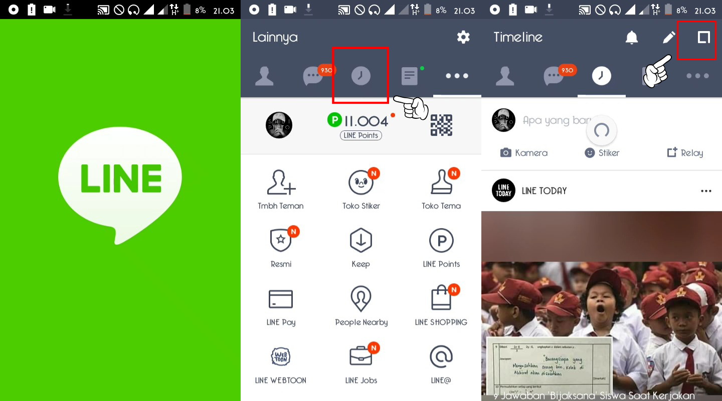 2. Buka aplikasi LINE, tap icon kompas, dan beralih ke icon square di pojok kanan atas.