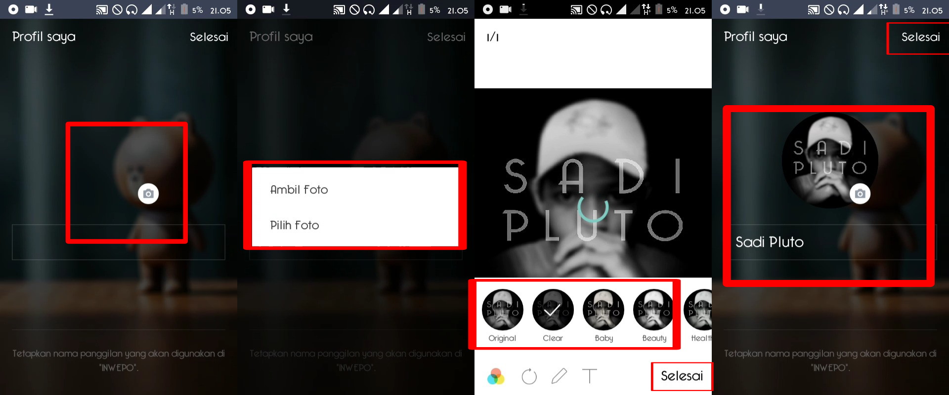 5. Pada tahap selanjutnya yaitu menambah gambar profile-mu dalam square. Kamu tap icon kamera di tengah layar, lalu pilihan akan muncul: menambahkan gambar dengan memotret langsung, atau dari galeri. Gambar yang di pilih juga bisa edit filter. tap selanjutnya.
