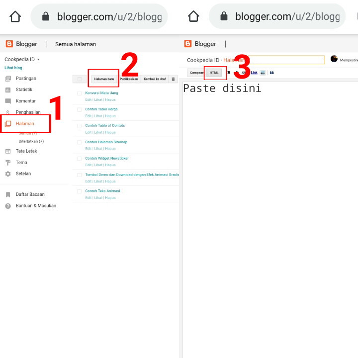 2. Pilih menu Halaman – Halaman Baru – Masuk ke mode HTML bukan Compose. Lalu pastekan kode Script HTML di bawah ini.