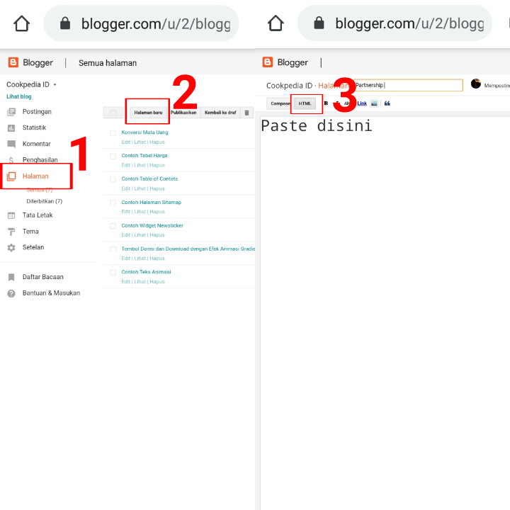 5. Pilih menu Halaman – Buat halaman baru – Masuk ke mode HTML bukan Compose. Masukan kode pemanggil di bawah ini.